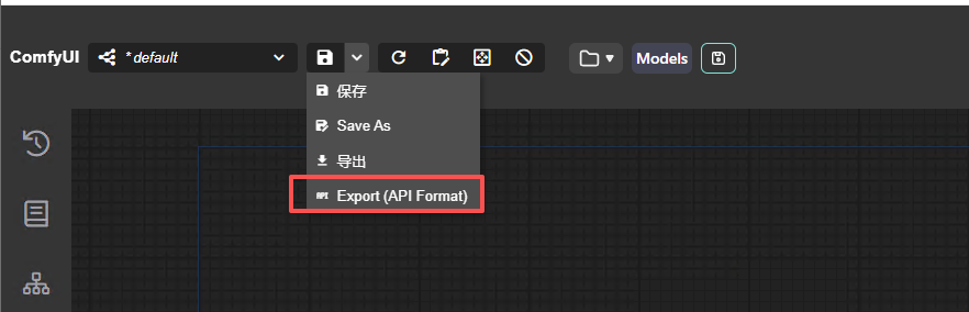 然后去到我们的 comfyui 工作流中,选择你想要 n8n 执行的工作流进行 api 的导出,注意不是导出工作流,是导出 api 哈。