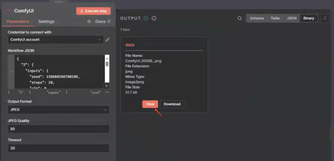 然后点击执行预览,在右侧的输出面板上多了一个二进制文件的面签,也就是生成了图片。可以选择点击 view 预览或者 download 把图片下载下来。
