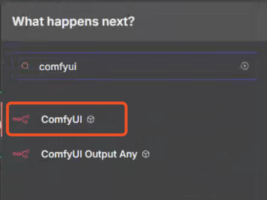 按下 tab 快捷键,在节点搜索框输入 comfyui,就会如下图一样显示我们之前安装的 comfyui 插件节点了,把第一个拖入到工作流中。