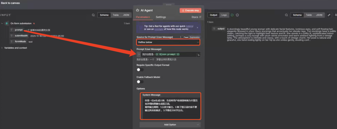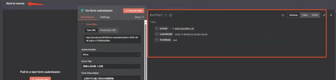 执行预览之后可以在右侧的输出部分看到输出提示词就是我们输入的。数据测试没有问题之后,点击左边的回到画布。