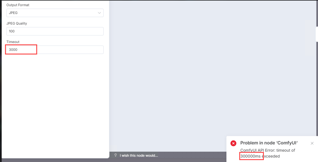 还有几个参数,比如设置导出图片是 jpg 还是 png,设置图片的质量(1~100)之间,还有超时时间,有些工作流比较复杂的话,这个时间可能要调长一些,这里我就全部默认了。