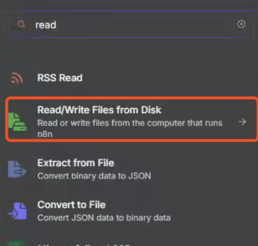 在节点搜索框输入 read,选择这个从磁盘读取或者写入磁盘节点。