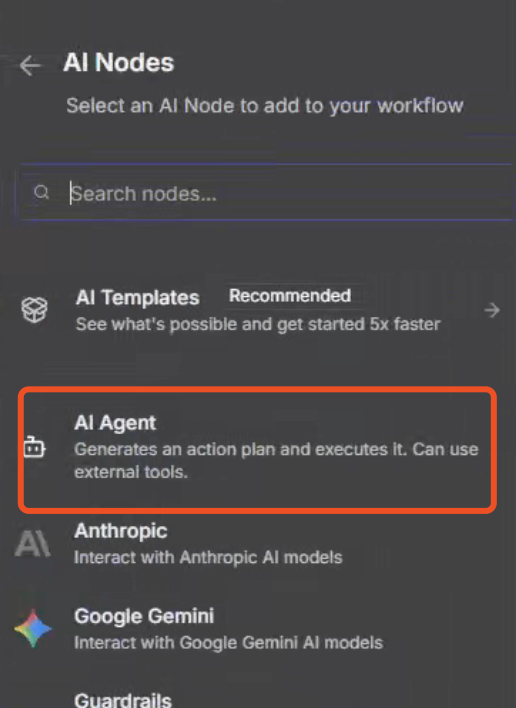 AI Agent 节点是一个集成的节点,由一个根节点和多个子节点组成。