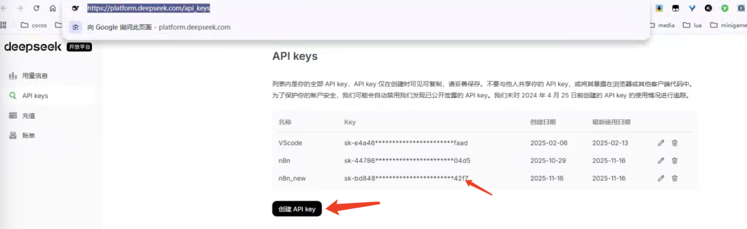 点击创建一个新的 api key,在弹出的窗口中给这个 api key 起一个方便识别的名字,比如我这里已经创建的两个 n8n 的。