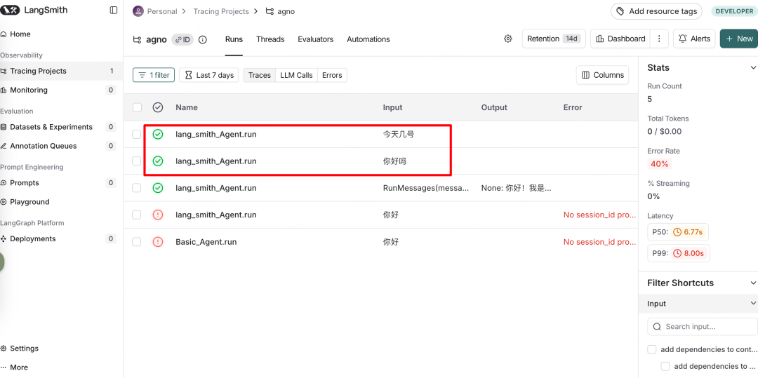文章演示了Agno对接LangSmith并上报链路日志,借助LangSmith可清晰直观的看到每一次的对话,包括与模型交互的提示词、输出内容和时间。