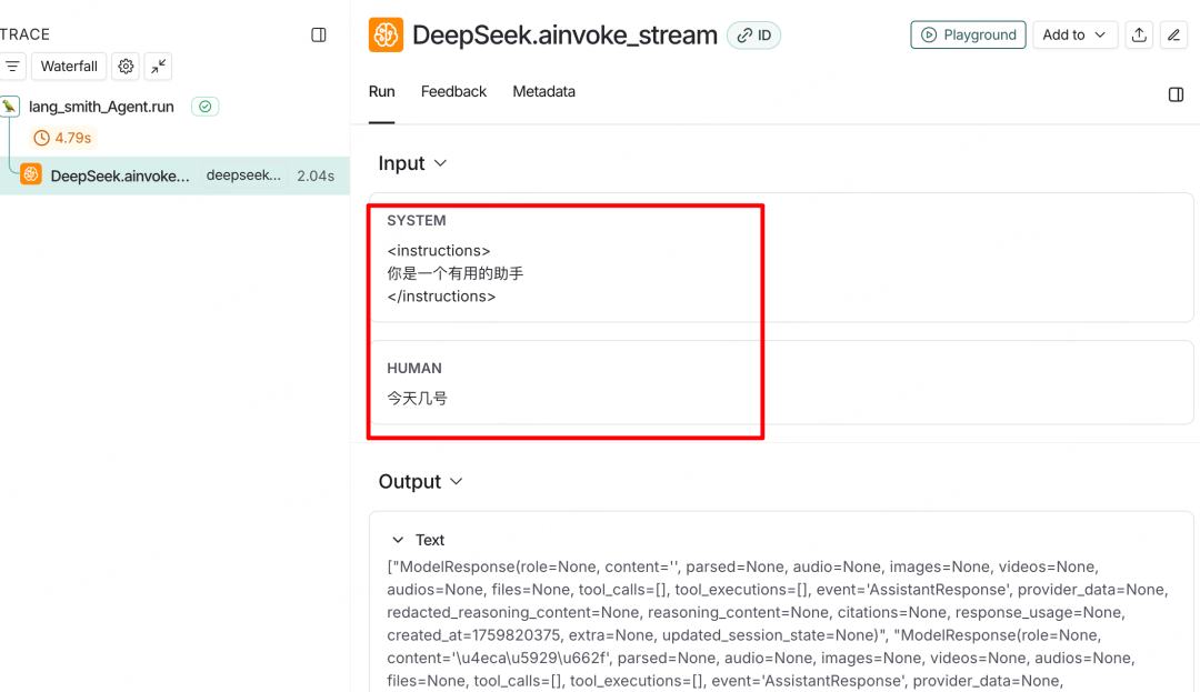 点击某一条Trace,可以看到详细的信息,包括输入给大模型的提示词(Agno可能根据Agent实例化参数生成提示词,监控就能很直观的看到与大模型交互的提示词)和模型的流式输出(中文被Unicode编码了):