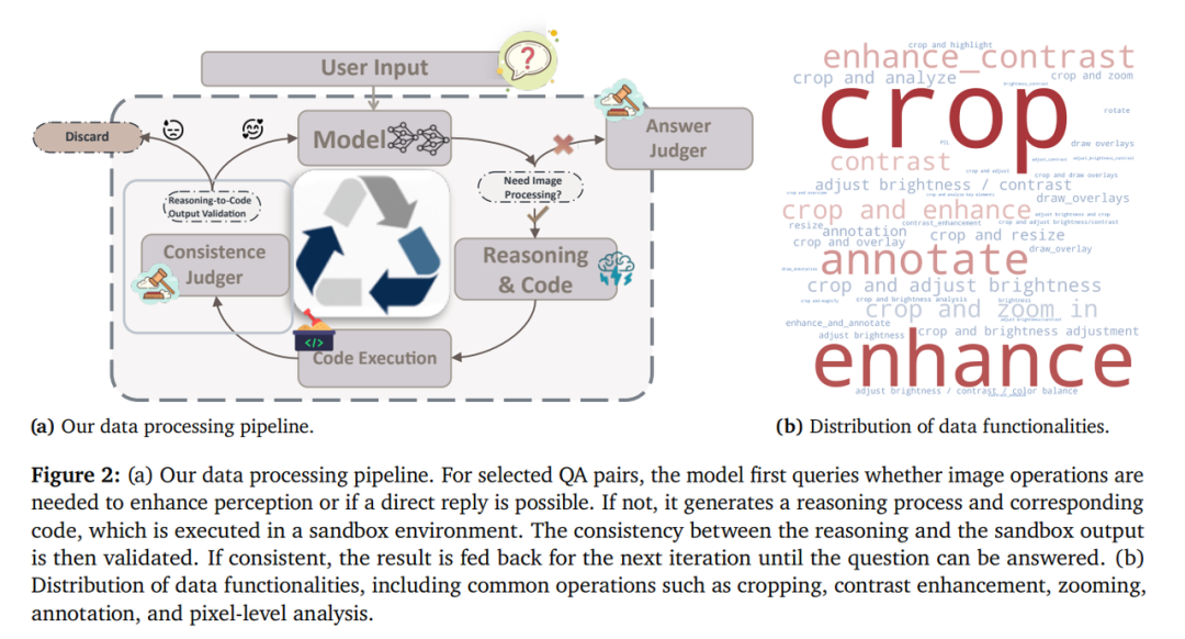 - 图像操作部分,让开源或闭源大模型(GLM4.6、Claude)通过编写代码对图像执行一系列操作,包括但不限于裁剪、旋转、对比度增强和像素级分析,每一步都对比代码输出与推理文本是否一致,4 次采样只留答对的样本数据。