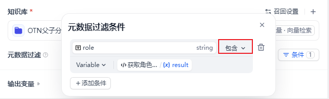 4、在知识检索节点设置元数据过滤,并使用包含条件,如下图所示