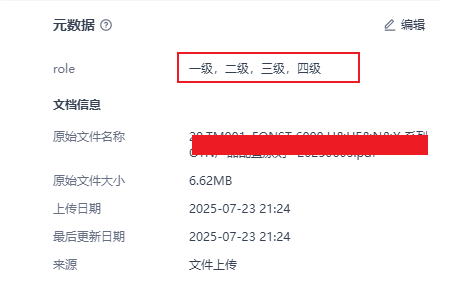 2、在知识库中增加string类型元数据role_level,并对文档进行标注,例如: