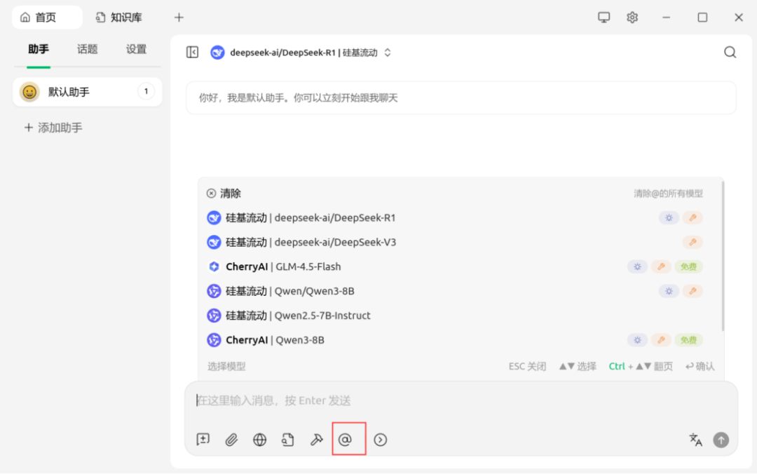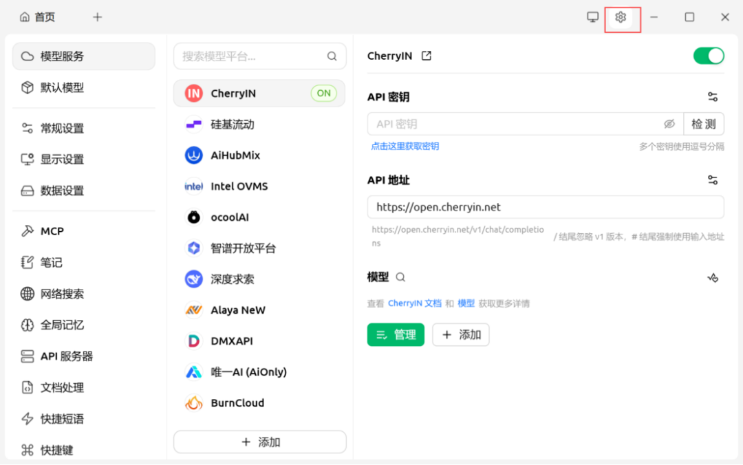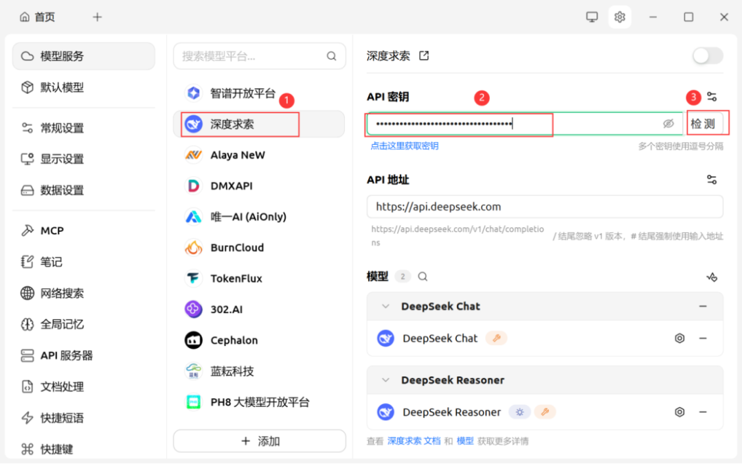 将API填入cherry,按下图顺序操作,这里的硅基流动可以直接使用