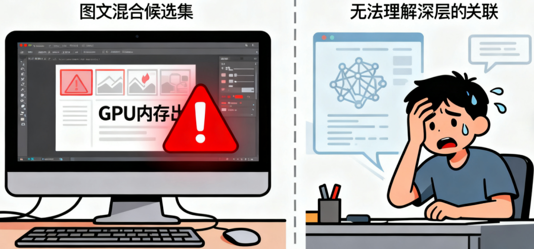 - 多候选场景效率极低:当候选样本超过20个,尤其是包含图像、视频等模态时,token数量会呈指数级增长,不仅推理时间拉长(我们之前测试过,K=50时单条查询要10秒),还容易超出模型上下文窗口,导致检索失败。