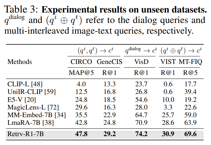 - 不可见数据集:在没训练过的对话检索、 interleaved图文检索任务上,Retrv-R1的R@5比基线模型高10个百分点以上,说明它学到的推理能力可以迁移。