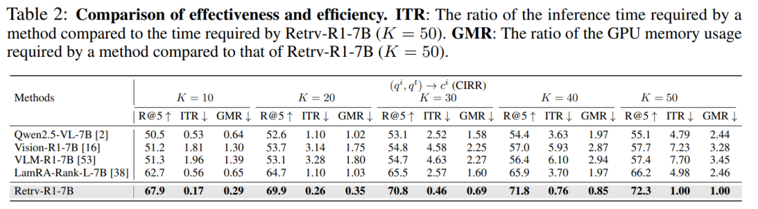 在包含16个亚任务的多模态检索基准M-BEIR上,Retrv-R1-7B在K=50时的R@5达到72.3,比之前的SOTA模型LamRA高6.1个百分点;而推理时间只有1秒,是Qwen2.5-VL的1/4.79,GPU内存占用也只有后者的1/2.44。
