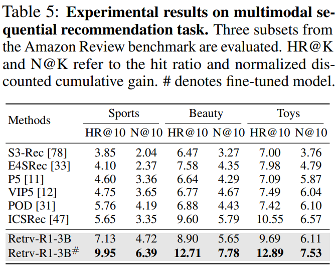 - 推荐系统任务:把Retrv-R1用到多模态推荐上,不用改模型结构,只调整输入指令,HR@10就达到12.71,比专门的推荐模型ICSRec高3.11个百分点——这意味着它不仅能做检索,还能适配需要关联匹配的其他任务。