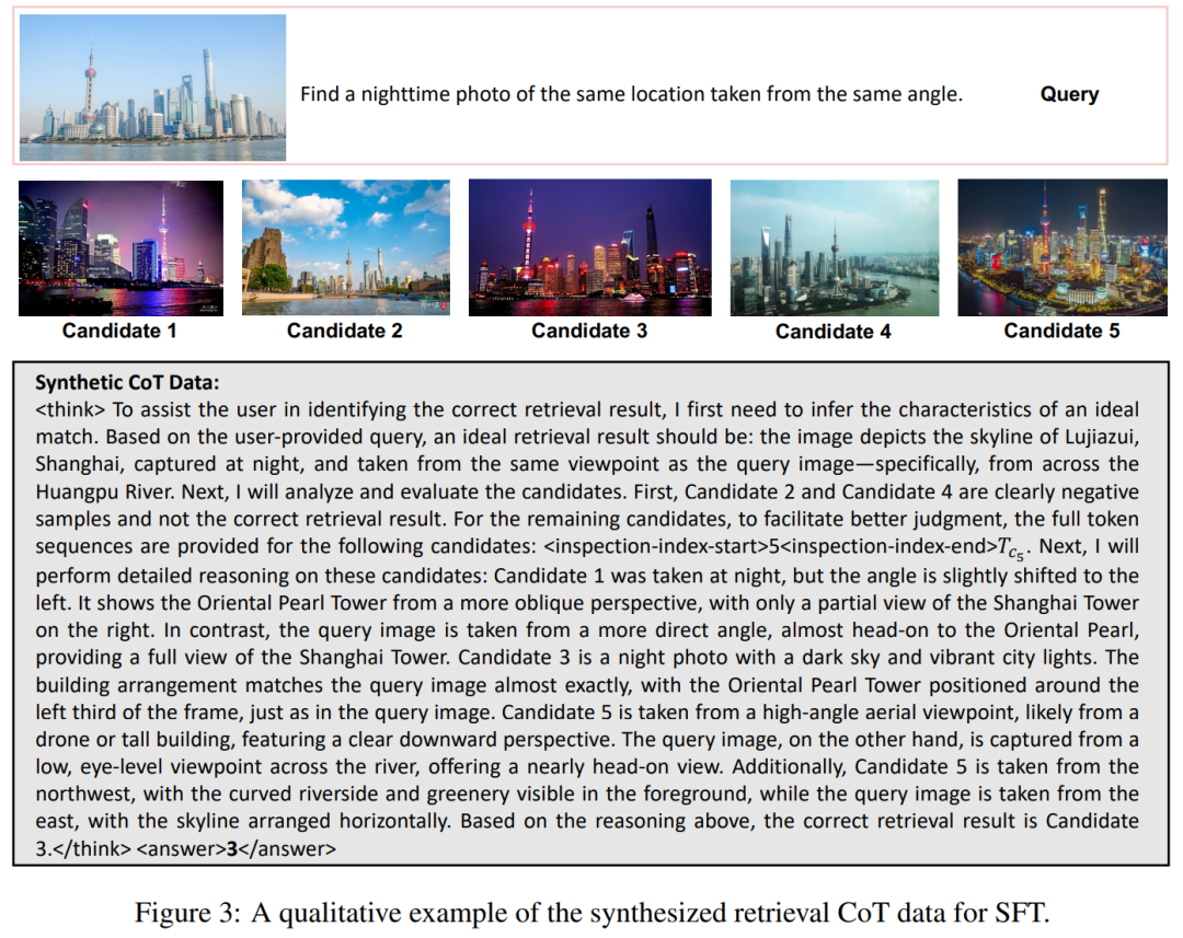 - 复杂场景检索不准:传统MLLM做检索,要么靠嵌入向量计算相似度(像盲人摸象,容易忽略关键关联),要么直接当QA任务处理(跳过推理过程,复杂查询根本扛不住)。比如在“找一张和白天照片同角度的夜景图”这类任务中,传统模型要么分不清角度差异,要么忽略“夜景”这个核心约束。