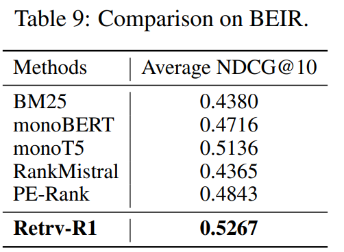 - 文本检索任务:在BEIR文本检索基准上,Retrv-R1的平均NDCG@10达到0.5267,超过专门的文本检索模型,证明它的框架是“通用”的,不是只适用于多模态。