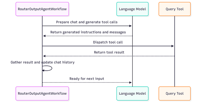 步骤 1 — chat():将用户消息加入对话历史,与可用工具一起喂给 LLM,由 LLM 决定调用哪些工具,返回 GatherToolsEvent。