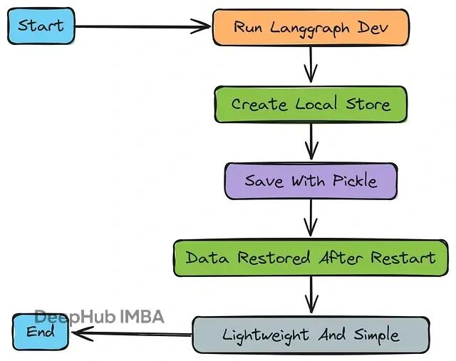 用 langgraph dev 命令运行应用时,LangGraph 会自动使用 Python 的 pickle 格式将存储保存到本地文件系统,并在重启开发环境后恢复数据。
