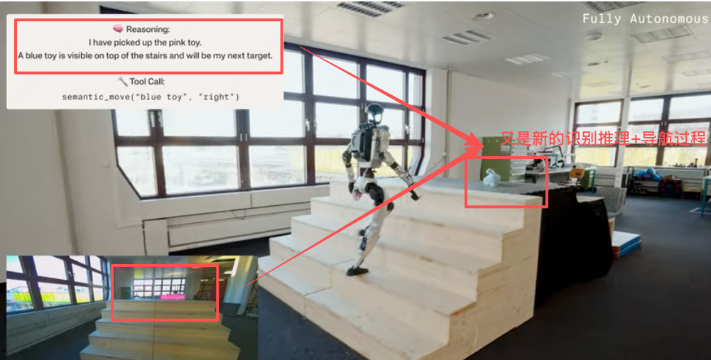 3)推理链路为:我已经捡起来了粉色玩具,蓝色的玩具在楼梯的正上放,这会是我下一个目标。接着就开始继续导航。调用的是导航行走函数。