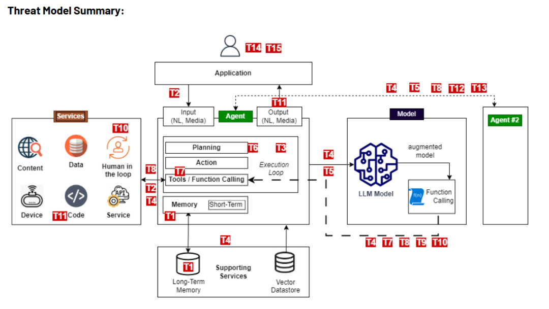 研究通过详细的威胁建模,识别出针对 Agentic AI 的 15 种核心威胁(TID T1-T15)。为了便于理解与防御,可以将这些威胁按照其针对的架构组件进行了分类梳理。