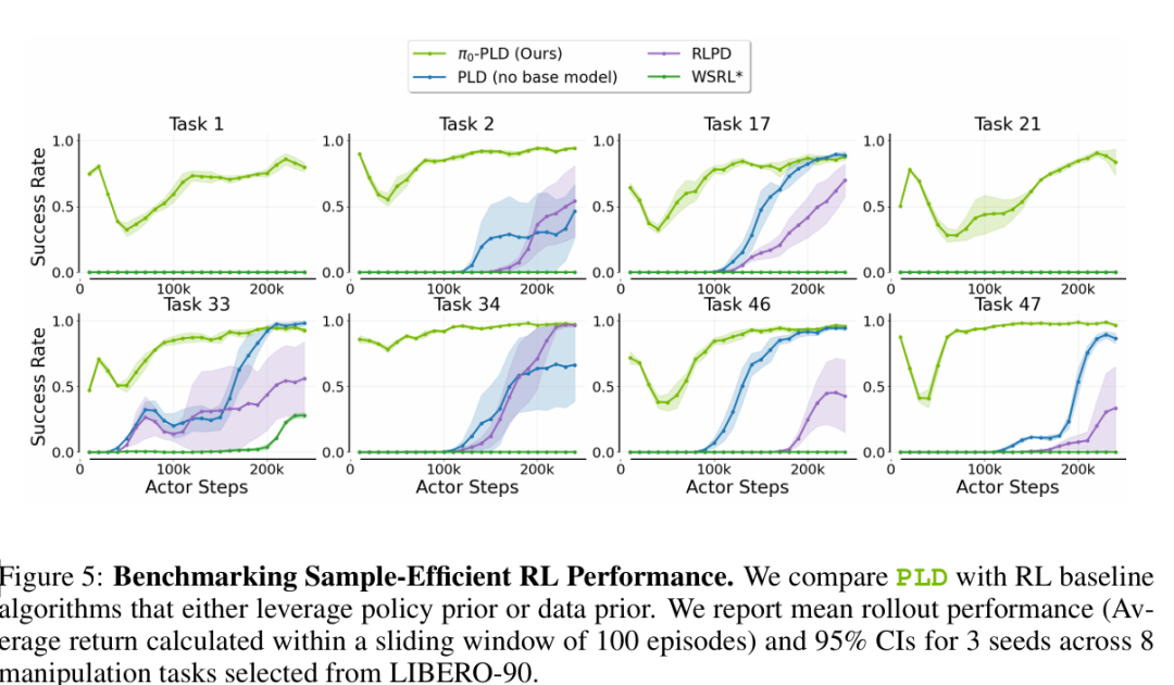 图5展示了250k步在线交互的训练曲线,包含3个随机种子的平均滚动性能和95%置信区间(CI)。结果表明:在LIBERO-90的8个任务上,PLD显著优于基准方法,证明其能有效利用VLA策略先验,并在低交互预算下实现出色的样本效率。