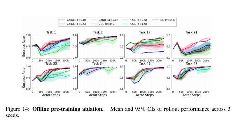 通过预训练评论家网络实现预热,有利于提升渐近性能并避免初始性能下降,但预训练方法的选择也至关重要。本文对比了CQL、Cal-QL和IQL三种预训练方法,仅使用基础策略的50条成功轨迹(而标准离线强化学习基准通常拥有大得多的数据量)。