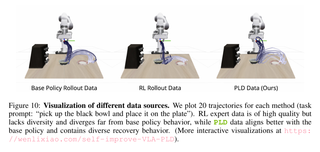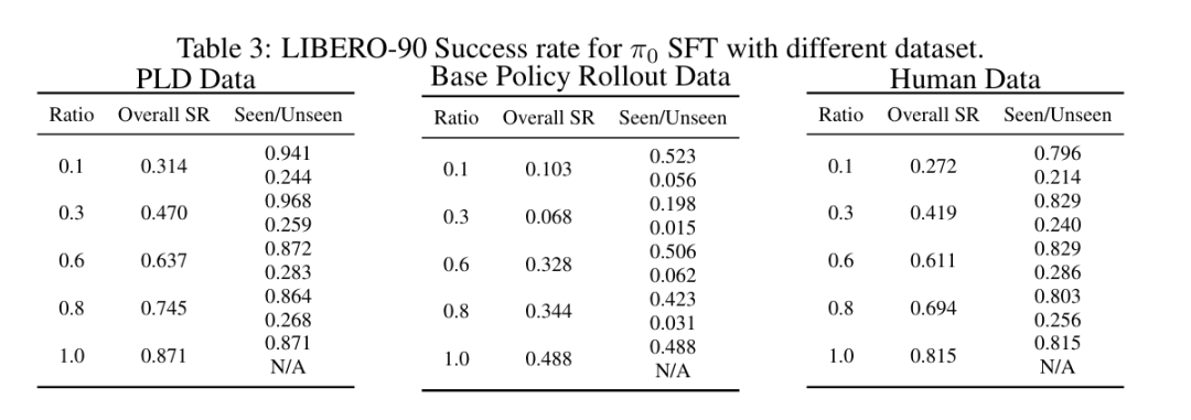 - PLD数据与其他演示数据源(如人类数据、强化学习专家滚动数据、VLA基础策略滚动数据)的对比效果;