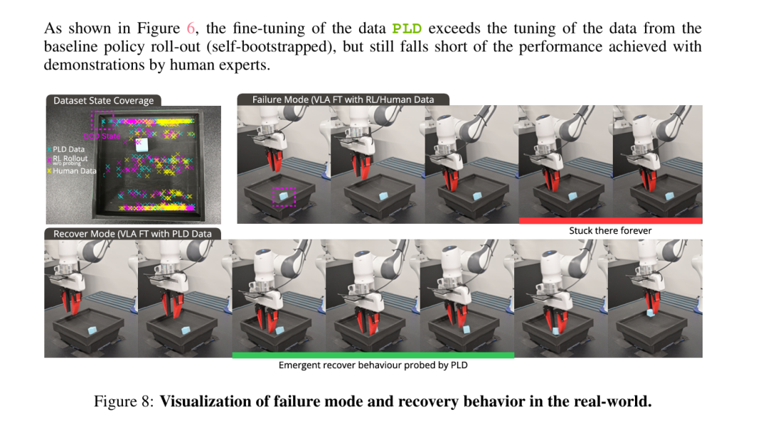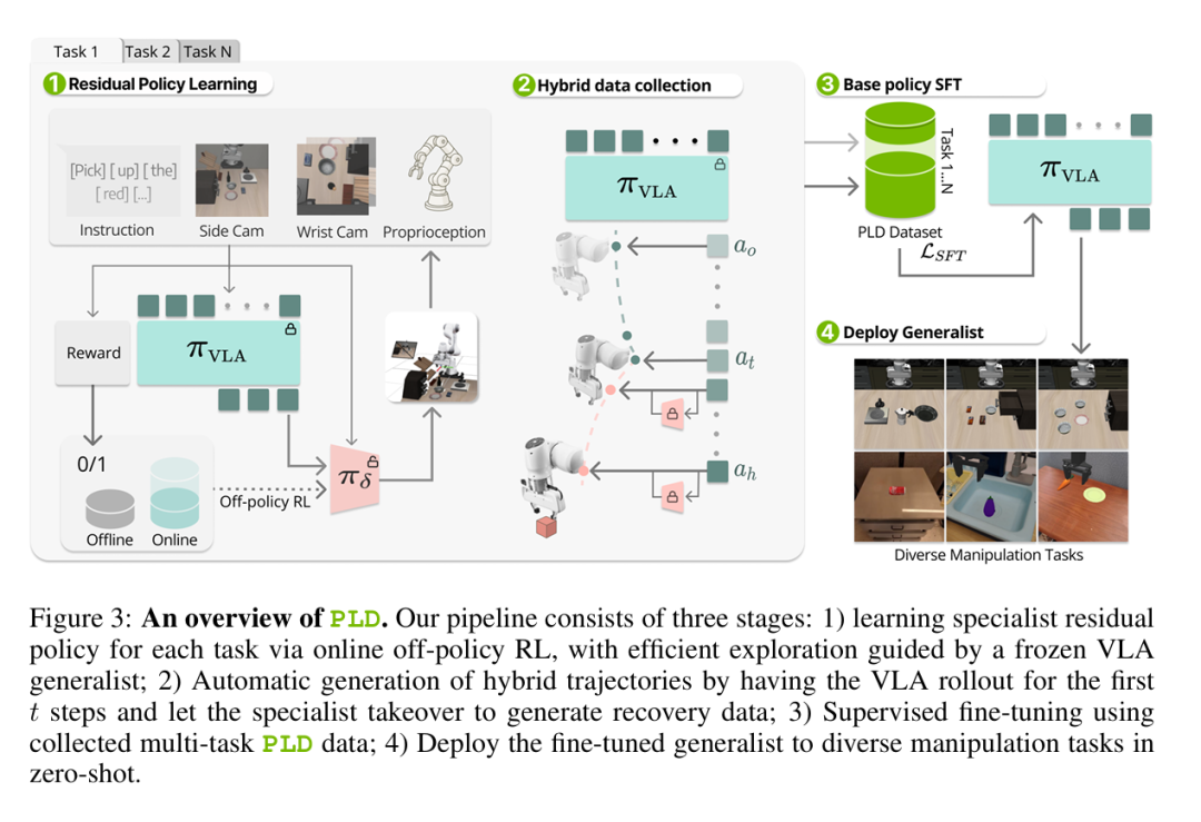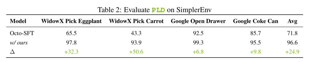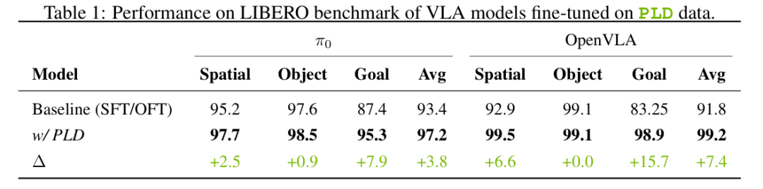 PLD的流程概览如图3所示。通过PLD,我们能借助VLA引导的探索高效获取任务特定的强化学习专家策略;进而,VLA模型利用PLD数据实现进一步改进,在LIBERO基准测试中达到99%以上的性能。