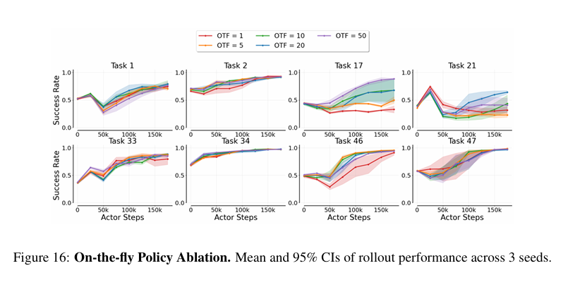 图16对比了不同样本量的效果:OTF能提升样本效率,较大的样本量(>20)显示出显著的性能提升,但实证表明渐近性能最终会趋于一致。本文默认设置OTF=1。