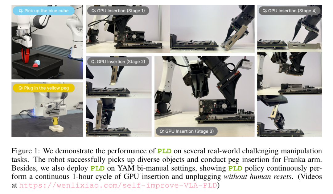 - 全面的实证验证:对设计选择进行大规模消融实验;此外,在Franka机械臂和YAM机械臂的灵巧操作任务上实现超99%的成功率,且能连续1小时执行GPU插拔操作而无需人工干预,为机器人基础模型的数据高效训练后优化提供了可能。