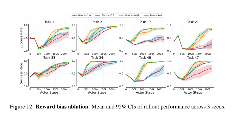 在渐近性能方面,PLD在报告的所有微调任务(超120个操作任务)上均能达到95%以上的性能。值得注意的是,PLD初期存在性能下降——这一现象表明训练初期残差策略开始偏离基础策略,进入潜在的非最优状态探索。PLD强化学习设计选择的消融实验详见附录B.2。