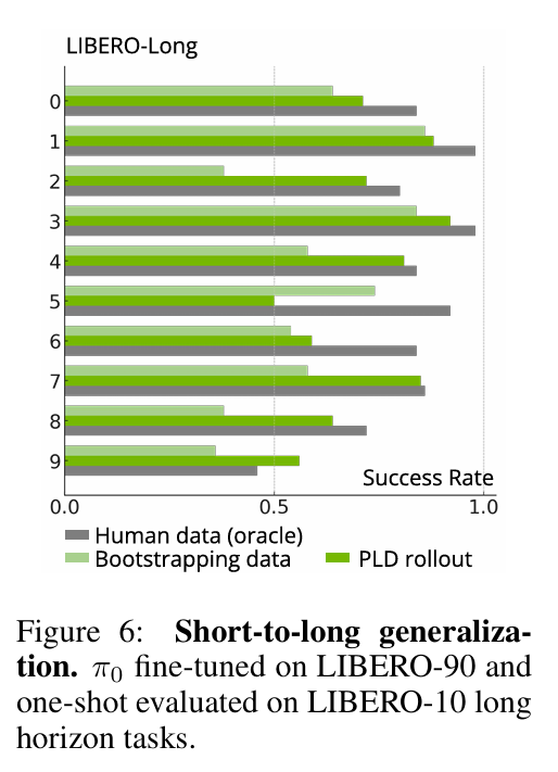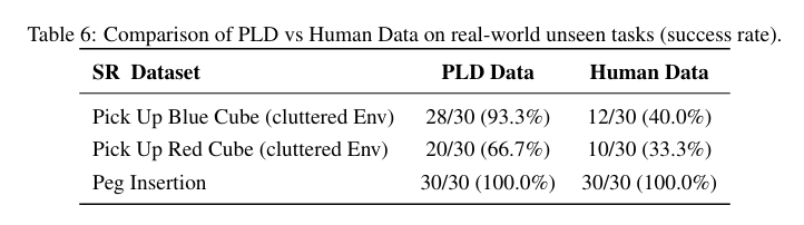 表6结果表明:基于PLD数据的VLA微调在泛化性能上优于基于人类遥操作数据的微调。