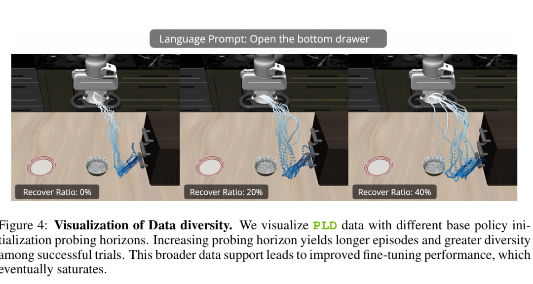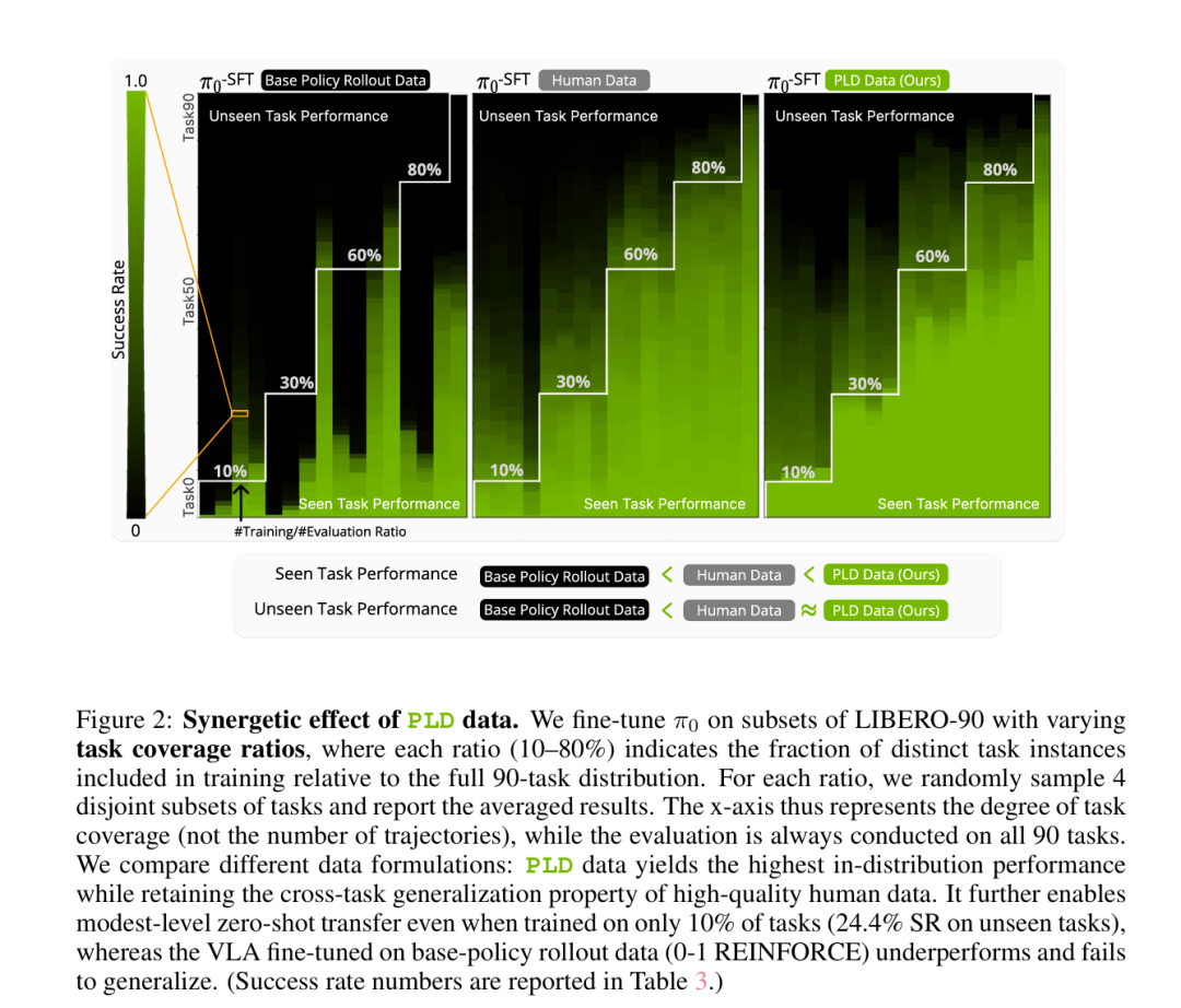 本文研究当适度的VLA通用模型作为策略先验时,PLD生成数据的协同效应。核心前提是:若能正确利用基础策略的先验知识,模型既能快速解决困难任务,又能高效探索。