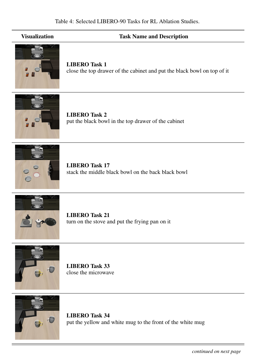 因此,ξ需要仔细调整,以在支持探索的同时最小化性能下降。对于单臂操作任务,建议在LIBERO中设置ξ=0.5,在SimplerEnv中设置ξ=0.1。