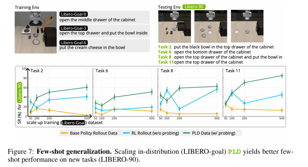 我们在多种场景下对PLD进行评估:在LIBERO基准测试中实现了近饱和的99%任务成功率,在SimplerEnv环境中性能提升超50%,并在真实世界的Franka机械臂和YAM机械臂灵巧操作任务中实现100%成功率。此外,消融实验表明,残差策略探测和分布感知回放是收集“与部署对齐的数据”的关键,这类数据可同时提升VLA模型在已见任务和未见任务上的性能。研究结果表明,由强化学习生成、与策略对齐的数据可超越纯遥操作演示数据,为VLA模型的自改进提供了一条可扩展路径。