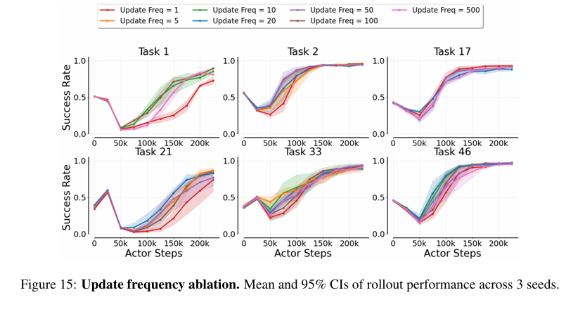 在SERL流程中,数据收集和策略学习异步运行,定期交换网络参数和在线数据。本文消融了更新频率(学习者在与数据收集演员同步参数之间执行的梯度步数),范围从1到500。