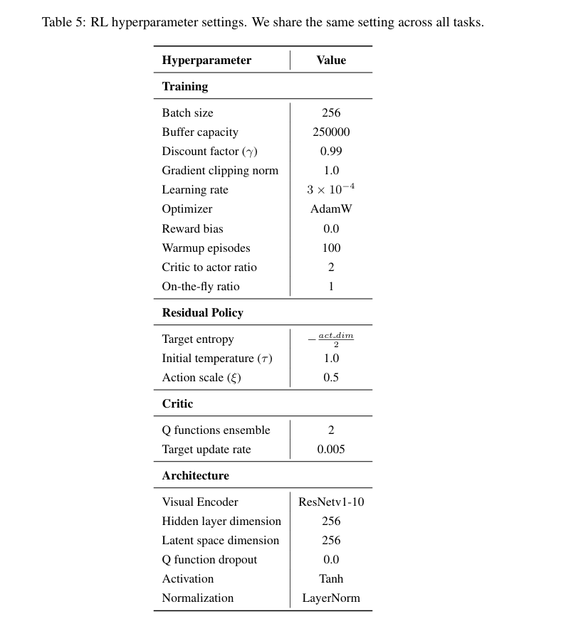 - 阶段1:在线专家策略获取:冻结VLA骨干网络,通过样本高效的离线强化学习为多个任务训练轻量级残差演员网络,使其能在任意状态下“接管”基础策略,并实现99%以上的任务成功率。