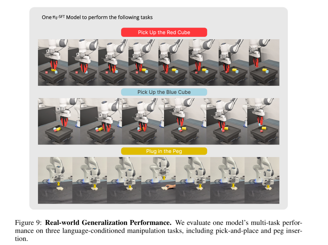 本文在π₀上进行SFT(基于“拾取蓝色立方体(整洁环境)”和“插销插入”数据),并在以下任务上评估微调后的策略: