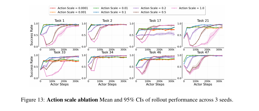 残差策略的核心组件之一是探索幅度。为避免与基础策略偏离过大导致unlearning,残差动作通常被缩放到[−ξ, ξ]区间。图13对比了不同残差动作缩放比例的效果: