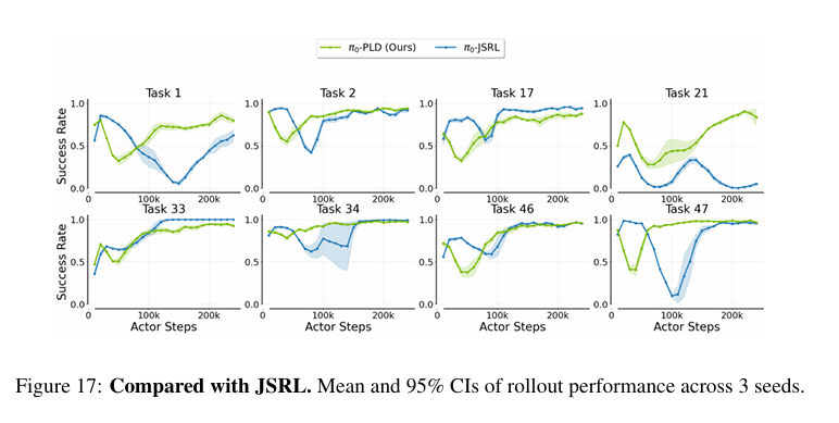 图17进一步展示了JSRL的结果(本文修改了原始实现,采用线性调度器)。JSRL总体上具有较高的样本效率,但在部分任务上无法收敛;而PLD能为所有任务可靠地提供解决方案。
