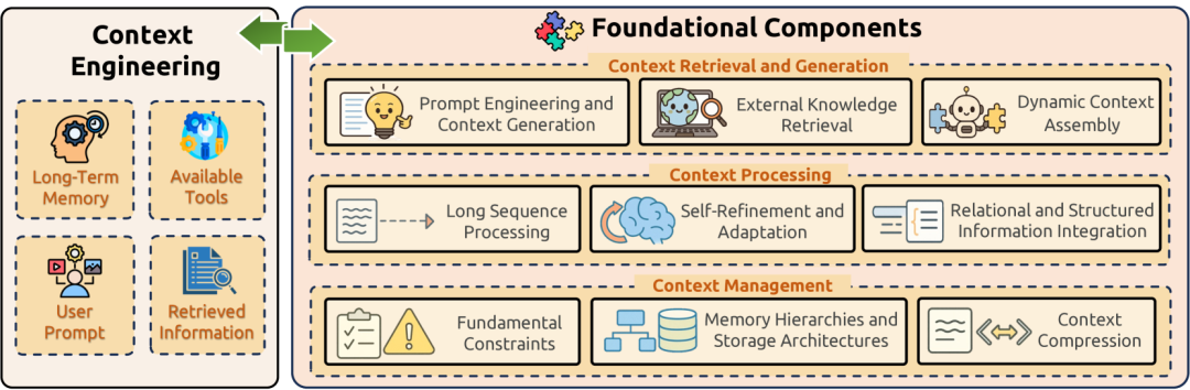 构成上下文工程的三大核心技术支柱:上下文检索与生成、上下文处理以及上下文管理。这些技术方法是实现高效、智能上下文系统的具体手段。
