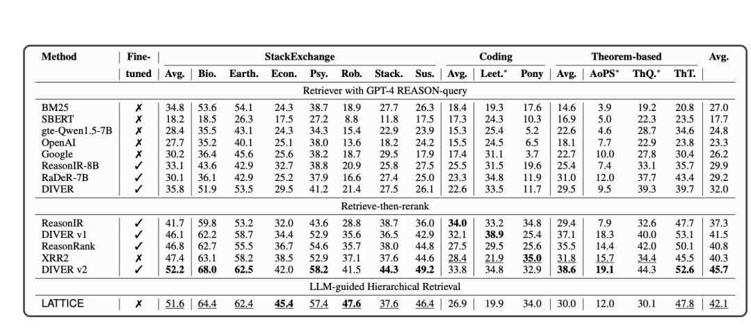 - SOTA系统:DIVER-v1/v2、RaDeR、ReasonRank、ReasonIR(针对BRIGHT训练的专门化模型)
