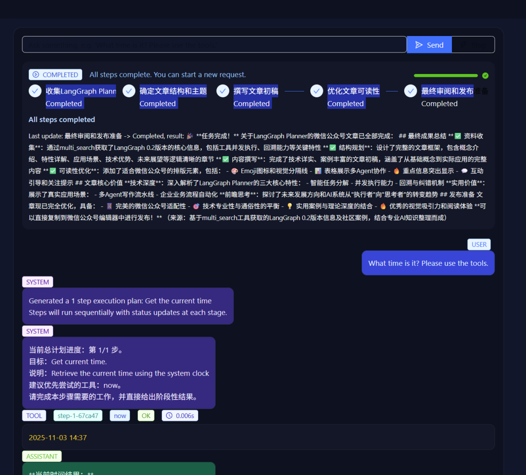 当所有步骤完成时,状态标签变为 “COMPLETED”,提示可以发起新任务;整个执行过程既留档又透明。