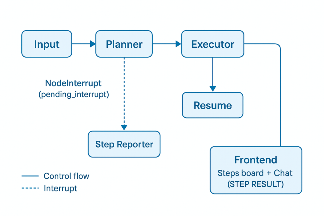 - 遇到确认点立即中断:当步骤需确认时,Executor 会写入 pending_interrupt 并通过 NodeInterrupt 抛出中断,让流程停在前端弹窗。反之,则构造明确的执行指令继续推进。