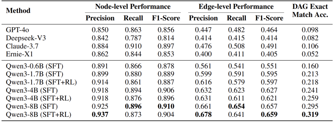是的。在Hard任务上,Qwen3-8B模型的DAG精确匹配从SFT的0.295提升到SFT+RL的0.319,相对提升8.1%。RL能纠正SFT难以捕捉的结构错误。
