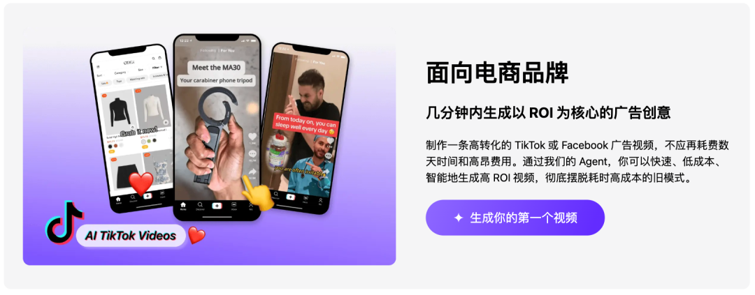 2、产品核心用户是全球范围内年营收在1000万到1亿元之间、有广告投放需求的电商用户。他们最关注生成视频后是否能“一刀不切”,以及投放ROI能否达到预期。