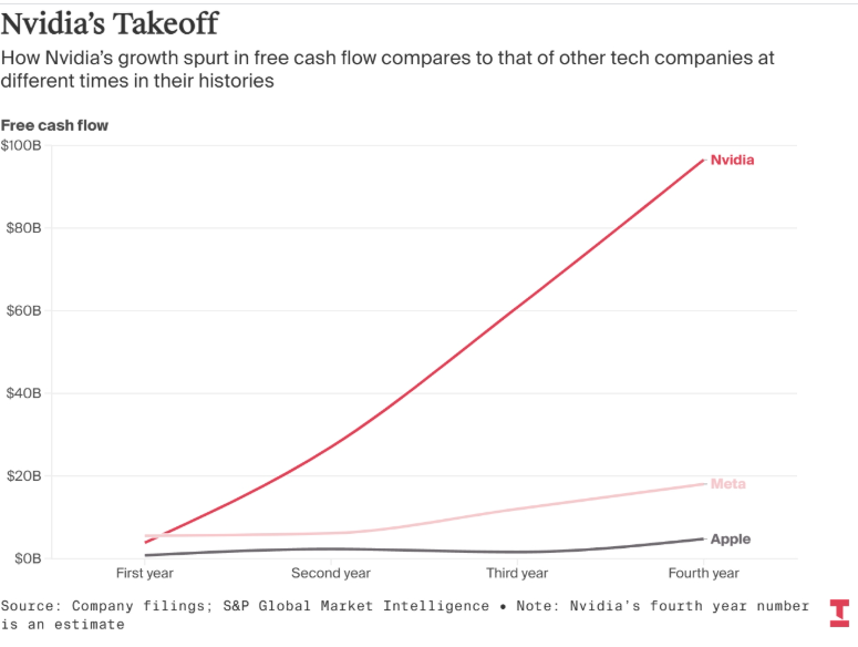 Nvidia的自由现金流在四年内接近百倍暴涨,远超Meta与Apple在各自巅峰时期的增速