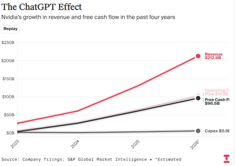 ChatGPT点燃AI浪潮后,Nvidia的营收与自由现金流在四年内直线上冲,远超资本开支的增幅,形成史无前例的「现金喷泉」