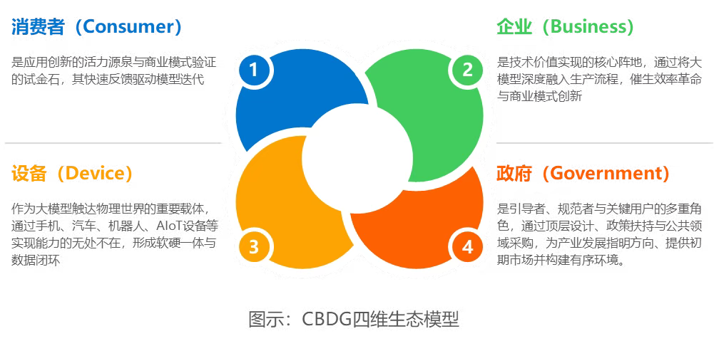 过去比拼参数规模、基准测试排名的单点对决,正在被生态构建、技术研发、行业赋能、商业变现、创新拓展的多维较量取代。而支撑这一转变的核心,正是这份报告中提出的“CBDG四维生态”(消费者、企业、设备、政府)新范式。