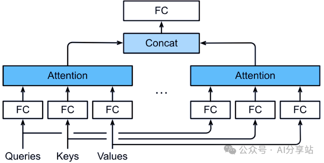 下面使用全连接层(FC)作为 Head,多个全连接层依次连接形成多头注意力(Multi-Head Attention),如下图所示: